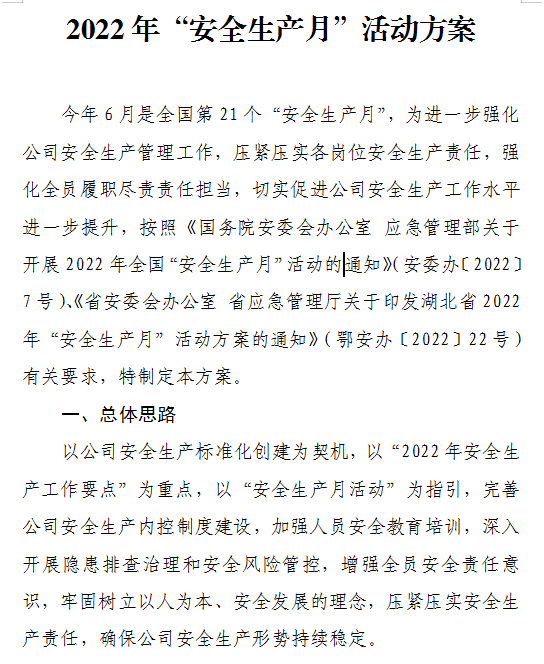 5月31日,公司研究制定了《2022年“安全生產月”活動方案》,成立了“安全生產月”活動領導小組,并以活動領導小組為核心,全面部署開展安全生產月專項活動,積極動員公司全員參與,充分彰顯了領導帶頭抓安全、人人講安全的良好風貌。