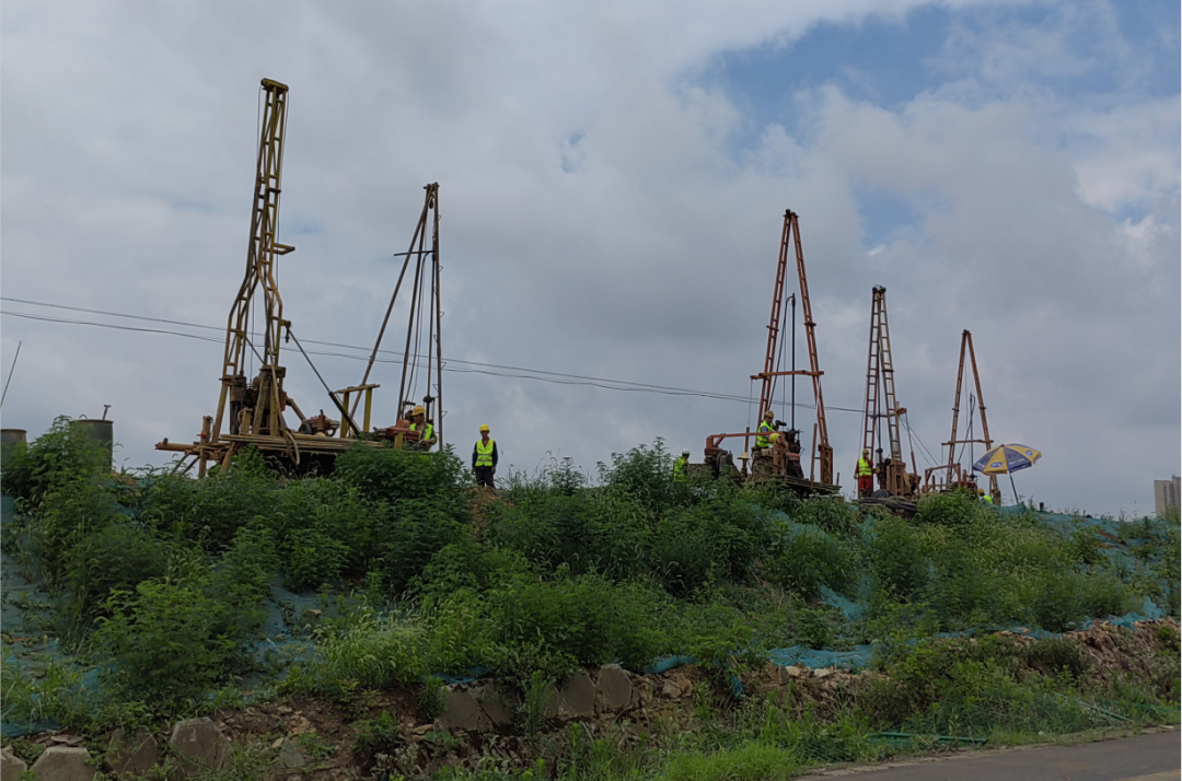 在施工勘察階段,根據(jù)業(yè)主要求,勘察需與施工同步進(jìn)行,彼時(shí)正值基坑開挖,作業(yè)面少,但項(xiàng)目任務(wù)重、時(shí)間緊。在接到業(yè)主進(jìn)場(chǎng)通知后,團(tuán)隊(duì)迅速召集了近百臺(tái)鉆機(jī)及相關(guān)作業(yè)人員,就作業(yè)面少問題,團(tuán)隊(duì)人員不斷與施工總包方溝通協(xié)調(diào)并制定施工、勘察方案,最終通過團(tuán)隊(duì)的拼搏努力及與總包方的密切配合,順利完成了施工勘察任務(wù)。