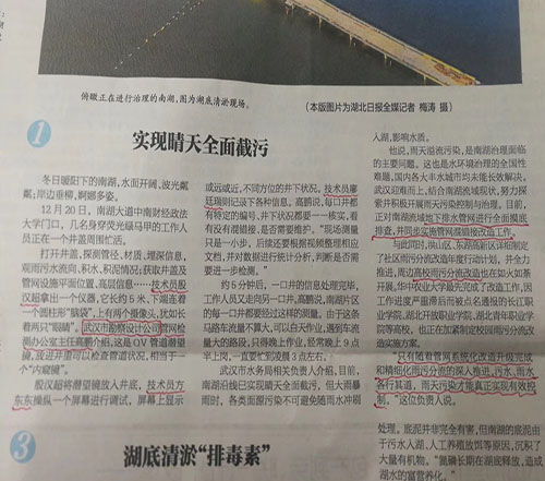 2018年12月20日,湖北日?qǐng)?bào)全媒記者親赴南湖隱患排查現(xiàn)場(chǎng),針對(duì)測(cè)繪工程公司所負(fù)責(zé)的“南湖水環(huán)境提升攻堅(jiān)工程”中的管線測(cè)量及隱患排查工作進(jìn)行實(shí)地采訪。現(xiàn)場(chǎng)技術(shù)員從現(xiàn)場(chǎng)作業(yè)流程、主要工作內(nèi)容及工作方式等方面作了詳細(xì)介紹,該采訪于2018年12月24日在湖北日?qǐng)?bào)第14版進(jìn)行了詳細(xì)報(bào)導(dǎo)。