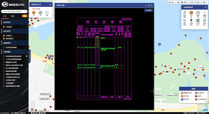 平臺基于標(biāo)準(zhǔn)化的工作流程,采用多重校審及分級管控的手段,通過配置,完成了從數(shù)據(jù)歸檔入庫到在線借閱的全過程服務(wù)與管理,滿足生產(chǎn)效率的同時保證了數(shù)據(jù)的準(zhǔn)確性及安全性。平臺支持鉆孔地層的標(biāo)準(zhǔn)化,完成了歷史存量數(shù)據(jù)的坐標(biāo)轉(zhuǎn)換,解決了因地層代號和坐標(biāo)系不統(tǒng)一而無法共享的問題。平臺實現(xiàn)了在網(wǎng)頁端基于CAD繪制勘察圖件的功能,支持柱狀圖、剖面圖、等值線圖的自動生成。可有針對性的對研究區(qū)域鉆孔篩選過濾,使統(tǒng)計分析結(jié)果可靠度更高。平臺具有較完善的數(shù)據(jù)接口,實現(xiàn)了與公司自主研發(fā)的勘察資料處理軟件的無縫對接,兼容各種地質(zhì)專題GIS數(shù)據(jù)。不僅可直接入庫勘察軟件數(shù)據(jù),還能以項目和鉆孔的維度輸出涵蓋地層及試驗信息的可在勘察軟件中直接利用的文件。